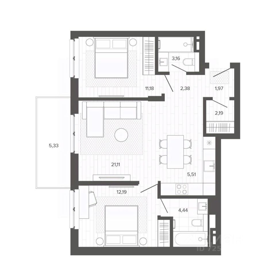 Продаётся 2-комнатная квартира в строящемся доме (Меланж), срок сдачи: IV-кв. 2026, общей площадью 58.66 кв.м., на 2 этаже. Меланж - дом рядом с парком. Эстетика городской жизни Эстетика городской жизни - значит иметь возможность слушать пение птиц, наслаждаться зеленью деревьев, заниматься спортом на свежем воздухе или отправиться на прогулку в любое время. Это не просто архитектурное решение, а отличный повод изменить свои ежедневные привычки, сделать жизнь более интересной и наполненной. Внутреннее благоустройство С помощью зданий будет сформирована закрытая территория. Это разделит пространство на общественное и частное, изолирует двор от городского шума и суеты, превратит его в безопасное и приятное место для отдыха жителей. Двор без машин, игровые площадки и зелёное зонирование - атрибуты более высокого качества жизни в домах комфорт класса. Архитектура В фасаде будут использованы благородные и ''тёплые'' материалы - кирпич. Это придаст зданию эстетическую привлекательность, практичность и долговечность. Архитектура дома, не только сохранит историю и традиции, но и подчеркнет его особую изысканность и индивидуальность на фоне современной застройки. Планировки для каждого Каждая планировка квартиры - тщательно продуманное решение, основанное на индивидуальных сценариях жизни будущих жильцов. Квартиры с окном в ванной, гостиная с шестиметровыми витражами или уютные апартаменты с отдельным входом направлены на формирование неповторимого образа жизни будущих владельцев недвижимости.