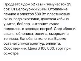 Код объекта: 1763068.Вашему вниманию предлагается уникальный объект недвижимости — современный кирпичный дом в селе Фирсово, Первомайский район, Алтайский край. Построенный в 2024 году, этот дом отличается высоким качеством материалов и продуманной планировкой. Общая площадь составляет 185,5 кв. м, из которых 123,7 кв. м — жилая площадь.Дом идеально подходит для круглогодичного проживания и обеспечен всеми необходимыми коммуникациями: электричеством, водоснабжением из скважины, газом и канализацией. Отопление осуществляется с помощью индивидуального котла, что обеспечивает комфорт и экономию.На участке также есть гараж на две машины, а благоустроенная территория площадью 8,62 соток предоставляет возможности для отдыха и садоводства. Дом расположен на угловом участке с подъездом по грунтовой дороге.Ремонт в состоянии white box позволяет новым владельцам реализовать свои дизайнерские идеи и создать уютное пространство по своему вкусу. Два раздельных санузла обеспечивают удобство для всех членов семьи.Это предложение особенно актуально для тех, кто ищет спокойное место для жизни вдали от городской суеты, но при этом не хочет отказываться от комфорта и доступности всех необходимых услуг. Расстояние до города составляет всего 15 км, что делает этот дом идеальным выбором для семей, ищущих гармонию между уединением и доступностью городской инфраструктуры.Прошу обратить внимание,что в шаговой доступности располагается большой детский сад,есть частный детский сад ''Теремок'',школа,дом культуры,магазины ''Ярче'', '' Аникс'',аптеки,спортивная школа,есть футбольная и волейбольная площадки.,шиномонтажки,рядом большой строительный магазин ''Альтера''.Регулярно ходят маршрутные автобусы до города.,по времени 15 минут езды.Позвоните нам прямо сейчас, чтобы узнать больше и записаться на просмотр!Мы гарантируем безопасную сделку и юридическую поддержку нашим Клиентам. Поможем одобрить ипотеку с сниженной ставкой.