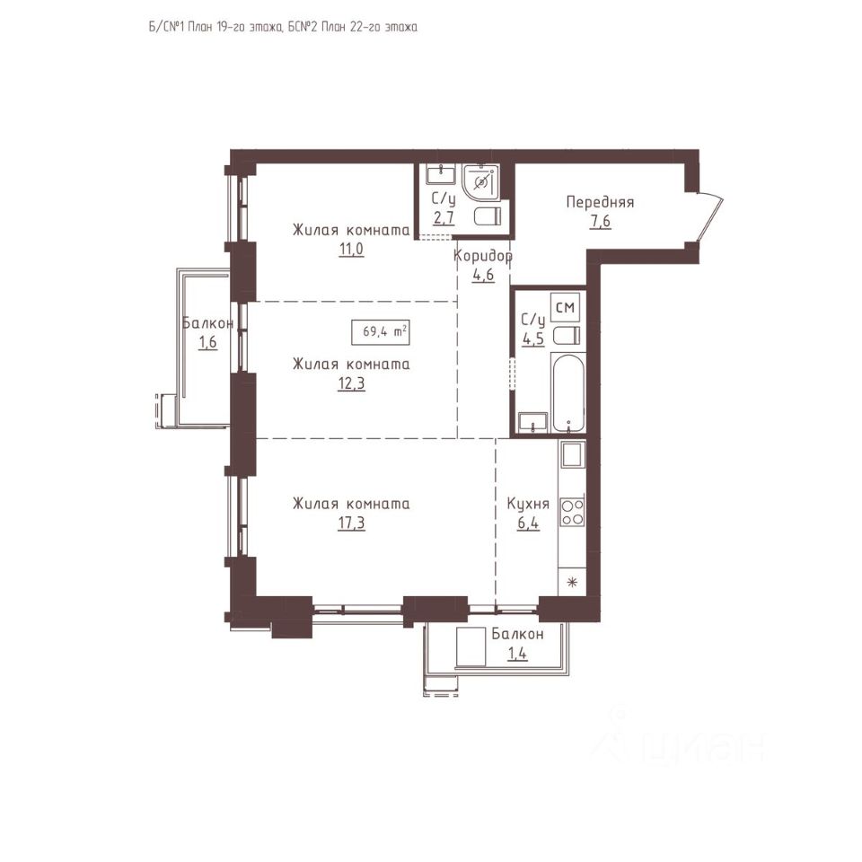 69 м² · Этаж 19 из 23