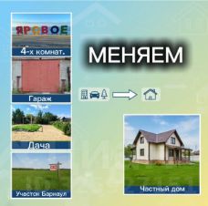 Меняем: 4-х комнатная квартира, 78 м², 5/5 этаж, светлая. Гараж в 3 обществе. Дачный участок в Яровом (приватизирован). Земельный участок в Барнауле (с документами).Что хотим взамен: Частный жилой дом (кирпич, брус) в любом районе в г. Яровое. Рассмотрим любые варианты, смотрим на состояние и метраж.
