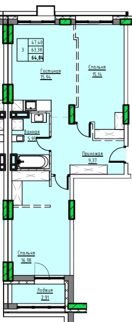 Продаётся 3-комнатная квартира в строящемся доме (Дом 1), срок сдачи: II-кв. 2029, общей площадью 64.84 кв.м., на 8 этаже. 10-ти этажный жилой дом в г. Заринске по адресу пр-т. Строителей, 29в. Проектом предлагается 3-х подъездный, 10-ти этажный жилой дом с встроенными на первом этаже помещениями общественного назначения. Исходя из ориентации дома входы в подъезды предусмотрены со стороны двора, тогда как в нежилые помещения - со стороны пр-т. Строителей. Вокруг здания предусматривается круговой проезд для автомобильного транспорта. Парковки для постоянного, временного хранения автомобилей, а также парковки для нежилых помещений предусмотрены, при этом согласно нормативам градостроительного проектирования Алтайского края от 29.12.2022 N 537, машино-мест может располагаться на прилегающей территории более 90 штук. Детские, спортивные площадки запроектированы с учетом нормативных расстояний от жилья и парковок. В жилом доме предусмотрено 222 квартир в том числе: Студии - 841-комн. - 482-х комн. - 543-х комн. - 304-х комн. - 6Имеется возможность объединения квартир для увеличения площади. Высота первого этажа - 3,6 м, жилых этажей - 3 м. В подвале предусмотрены кладовые для хранения негорючих вещей жильцов. В каждом подъезде имеется лестничная клетка и два лифта - пассажирский грузоподъемностью 400 кг и грузопассажирский грузоподъемностью 630 кг. Практически каждая квартира имеет выход на просторную застекленную лоджию площадью 6-9 кв.м. Все окна увеличенной высоты, что обеспечивает максимальное дневное освещение квартир. Часть квартир дополнительно оборудована мастер спальнями и гардеробными. Конструктивная схема монолитный железобетонный каркас с заполнением кирпичом и газобетоном с утеплителем. Облицовка 1-2 этажей клинкерным кирпичом. Выше штукатурка по стене. Окна - из металлопластика. Витражи 1-го этажа, остекления балконов - алюминиевые. Прилегающая территория к дому комплексно благоустраивается с асфальтированием проездов, озеленением и тротуарной плиткой. Площадки для игр детей и занятия спортом укомплектовываются элементами заводского изготовления. Жилой дом после строительства украсит центральную часть г. Заринска.