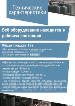 Арт. 128542836 В нашей базе НОВЫЙ объект- КОММЕРЧЕСКАЯ недвижимость!Характеристики объекта:Действующее производство на земельном участке площадью 1 гаофисная часть находится на 2 этаже административного здания, площадью 160 кв. м.на 1 этаже находится ресторан площадью 200 кв. м,-молочный цех - 800 кв. мколбасный цех - 1030 кв. мпроходная зона с гостиницей - 100 кв. м.котельная - 100 кв. мна территории находятся складские помещенияпод колбасным цехом находится полноценное подвальное помещениена территории завода имеется своя электрическая станцияпо периметру завода ограждение из бетонных плитвсе оборудование находится рабочем состоянии ЛЕГКО КУПИТЬ: Можно купить в ипотеку. Объект без долгов и обременений. Быстрый выход на сделку. Покупка за наличный расчет. Рады будем ответить на все ваши вопросы с 9:00 до 21:00! Поможем одобрить ипотеку по более выгодной % ставке.