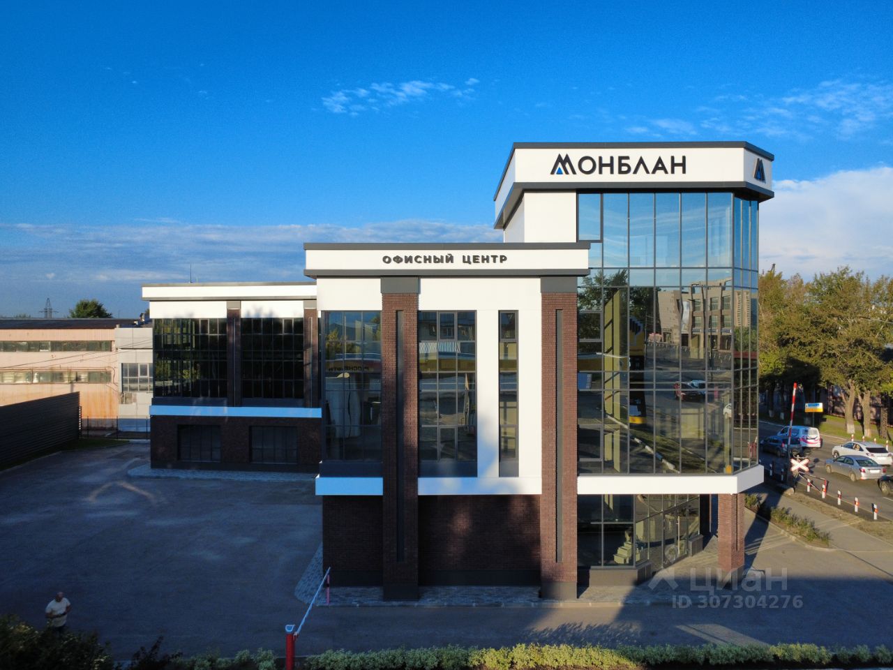Большая благоустроенная территория для парковки на территории здания на 30 автомобилей со шлагбаумом.