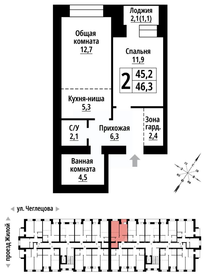 Продаётся 2-комнатная квартира в строящемся доме (Корпус 1), срок сдачи: II-кв. 2027, общей площадью 46 кв.м., на 2 этаже. ЖК ''Тургенев'' на ул. Чеглецова, 25а представляет из себя два кирпичных здания высотой 9 этажей. Предлагаем к покупке первый корпус, состоящий из двух подъездов. В каждом запроектированы квартиры с продуманной планировкой от 34,8-57,7 квадратных метров. Фасады выполнены в стилизованных формах с использованием остекленных лоджий и архитектурной подсветкой. Высота 1 и 9 этажа - 3 метра. На первом этаже предусмотрены нежилые помещения с гибким функциональным назначением.