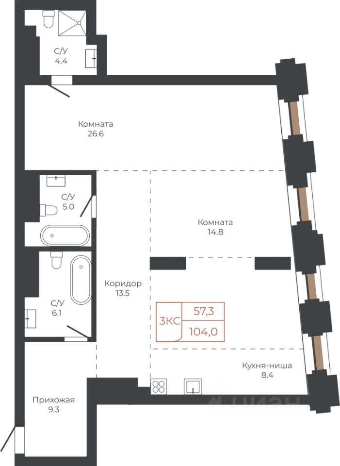 Продаётся 3-комнатная квартира в строящемся доме (Башня ''Мира'' (Корпус 2)), срок сдачи: I-кв. 2030, общей площадью 104 кв.м., на 7 этаже. Две башни формируют принципиально новое городское life-style пространство для жителеи и горожан. Единыи ансамбль площади Баварина и набережнои станет новым городским центром. АРХИТЕКТУРНЫЙ КОМПЛЕКС СТАНЕТ СИМВОЛИЧЕСКИМИ ВОРОТАМИ В ГОРОД И ЕГО ВИЗИТНОИ КАРТОЧКОИ И ОТРАЗИТ РАЗВИТИЕ БАРНАУЛА. Инфраструктура и расположение ТЕРРИТОРИЯ КОМПЛЕКСА - ВАЖНАЯ ТОЧКА, СВЯЗЫВАЮЩАЯ ДЕЛОВОИ И КУЛЬТУРНЫИ ЦЕНТРЫ БАРНАУЛА. БАШНИ ЗАМЫКАЮТ СТВОР УЛИЦЫ ЛЕНИНА И СЛУЖАТ ГОРОДСКИМИ ВОРОТАМИ НА НАБЕРЕЖНУЮ. Башни ''Столица'' и ''Мира'' будут буквально парить в воздухе у набережной. Дома установят на стилобат - платформу до высоты третьего этажа. Решение даст возможность пересекать территорию насквозь через комплекс к реке. Башни создают новые пешеходные связи со стороны улицы Ленина к набережнои.