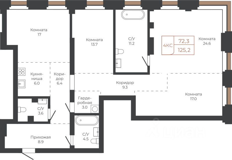 Продаётся 4-комнатная квартира в строящемся доме (Башня ''Столица'' (Корпус 1)), срок сдачи: I-кв. 2030, общей площадью 125.2 кв.м., на 4 этаже. Две башни формируют принципиально новое городское life-style пространство для жителеи и горожан. Единыи ансамбль площади Баварина и набережнои станет новым городским центром. АРХИТЕКТУРНЫЙ КОМПЛЕКС СТАНЕТ СИМВОЛИЧЕСКИМИ ВОРОТАМИ В ГОРОД И ЕГО ВИЗИТНОИ КАРТОЧКОИ И ОТРАЗИТ РАЗВИТИЕ БАРНАУЛА. Инфраструктура и расположение ТЕРРИТОРИЯ КОМПЛЕКСА - ВАЖНАЯ ТОЧКА, СВЯЗЫВАЮЩАЯ ДЕЛОВОИ И КУЛЬТУРНЫИ ЦЕНТРЫ БАРНАУЛА. БАШНИ ЗАМЫКАЮТ СТВОР УЛИЦЫ ЛЕНИНА И СЛУЖАТ ГОРОДСКИМИ ВОРОТАМИ НА НАБЕРЕЖНУЮ. Башни ''Столица'' и ''Мира'' будут буквально парить в воздухе у набережной. Дома установят на стилобат - платформу до высоты третьего этажа. Решение даст возможность пересекать территорию насквозь через комплекс к реке. Башни создают новые пешеходные связи со стороны улицы Ленина к набережнои.