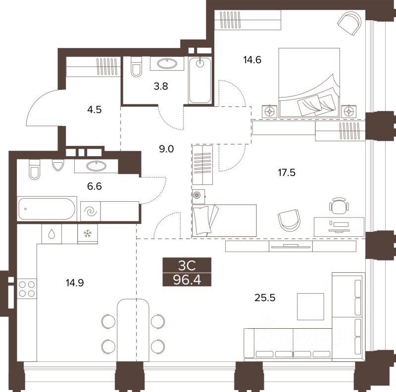 Продаётся 3-комнатная квартира в строящемся доме (Башня 1 и секция 1), срок сдачи: III-кв. 2029, общей площадью 96.4 кв.м., на 7 этаже. Новый жилой комплекс ''Сахаров Парк'' от Специализированного застройщика ''ДомСтрой-Барнаул22'' расположен по адресу: г. Барнаул, Социалистический пр-кт.