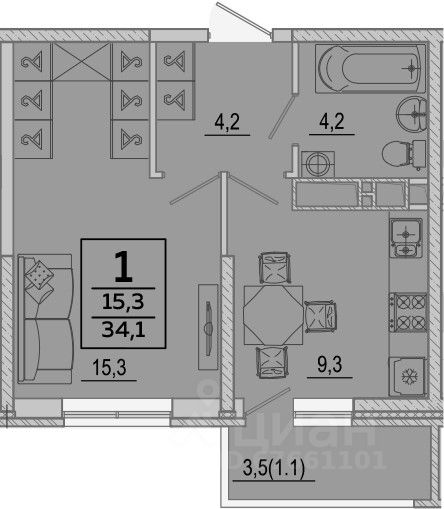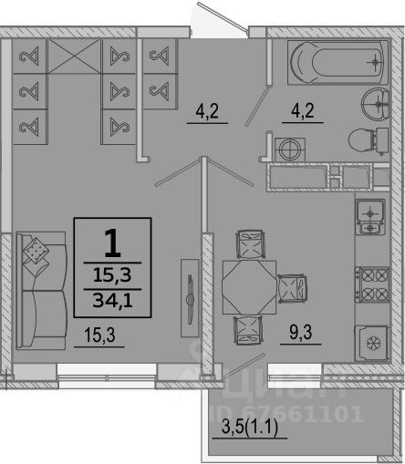 Общая площадь34,1 м2