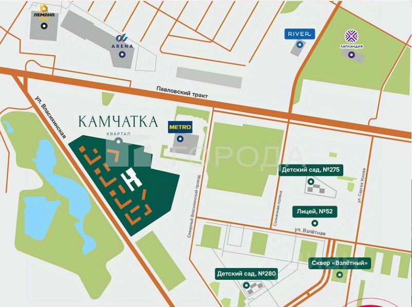 Код объекта: 1694036. Квартал ''Камчатка'' расположен в границах улиц Власихинская, Павловский тракт, Северный Власихинский проезд. В шаговой доступности находятся сквер ''Взлётный'', Центр здоровья и спорта ''River'', два детских сада и лицей 52. Недалеко расположены гипермаркеты ''Metro'' и ''Лента'', а также ТРЦ ''Арена''. Преимущества ЖК Камчатка: