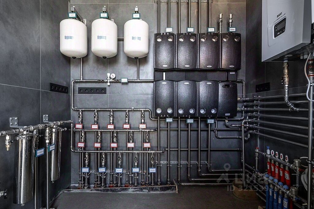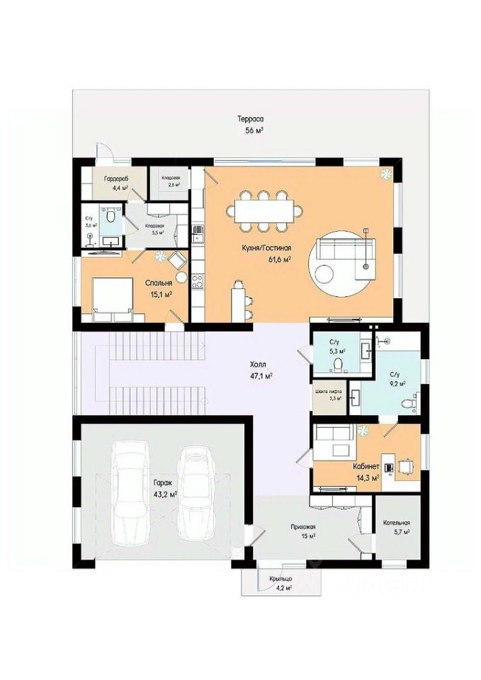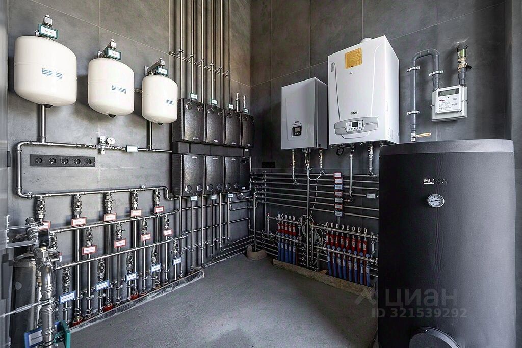 Просторная кухня-гостиная с панорамными окнами и выходом на террасу. Кабинет с санузлом. Блок для персонала с отдельным входом, спальней, санузлом, кладовой, гардеробом, постирочной. Гараж на два автомобиля (с возможностью увеличения до четырех). Котельная. Санузел.