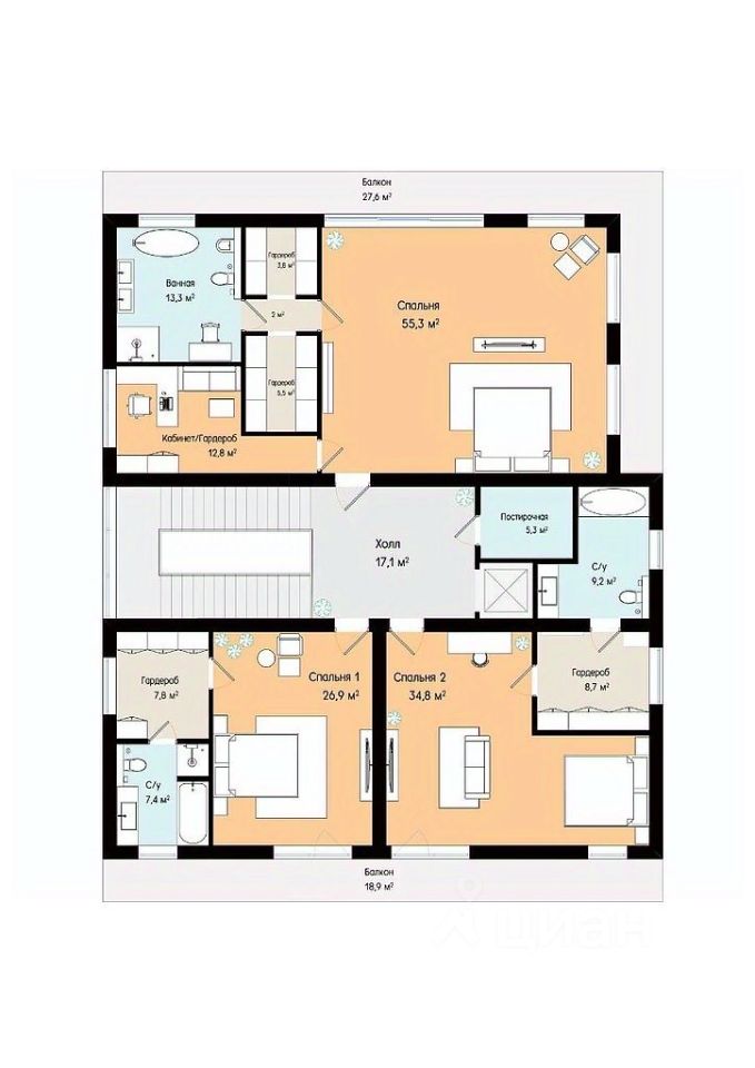 Мастер-блок: спальня, санузел, две гардеробных, терраса, помещение свободного назначения - сауна/комната отдыха/кабинет/вторая спальня. Две детских спальни, каждая с собственным гардеробом, санузлом и террасой. Просторный холл, постирочная и выход на третий этаж.
