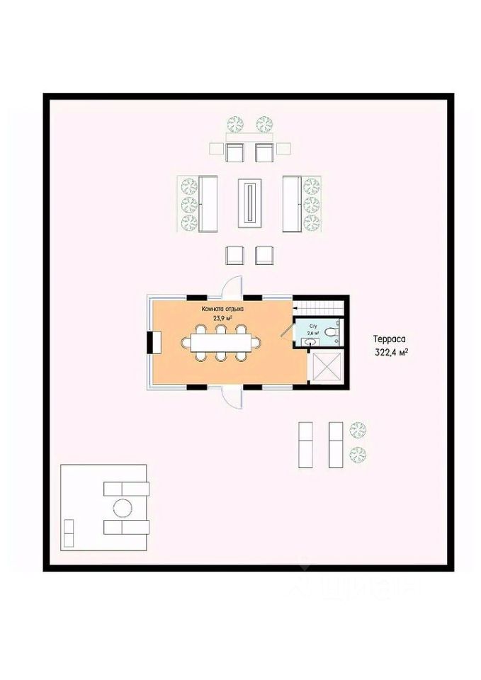 Комната отдыха, санузел. Терраса 320 м2, где на высоте восьми метров можно встречать рассветы с чашечкой ароматного кофе, наслаждаться закатами, устраивать барбекю-вечеринки с друзьями.