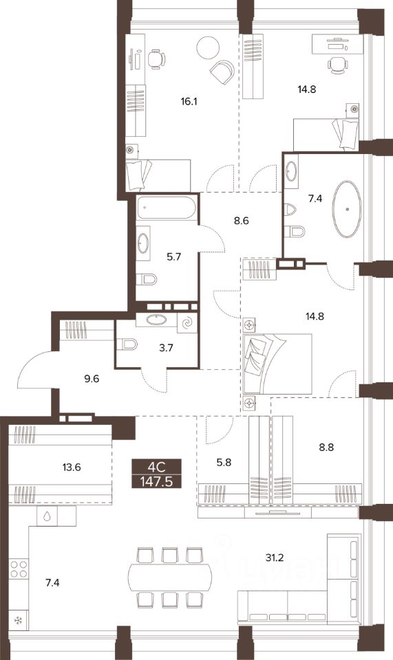 Продаётся 3-комнатная квартира в строящемся доме (Башня 3), срок сдачи: III-кв. 2029, общей площадью 147.5 кв.м., на 15 этаже. Новый жилой комплекс ''Сахаров Парк'' от Специализированного застройщика ''ДомСтрой-Барнаул22'' расположен по адресу: г. Барнаул, Социалистический пр-кт.