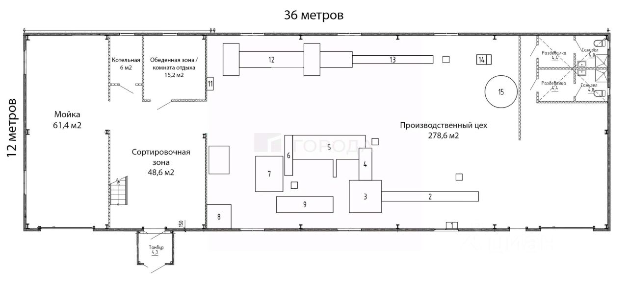 2. СОРТИРОВОЧНАЯ ЗОНА - 625 м2. Навес 25 х 25 метров с ветро и снегозащитой. 3. СКЛАД готовой продукции - 420 м2 (30 х 14 метров) с 4-мя откатными воротам высотой 3, 2 м.