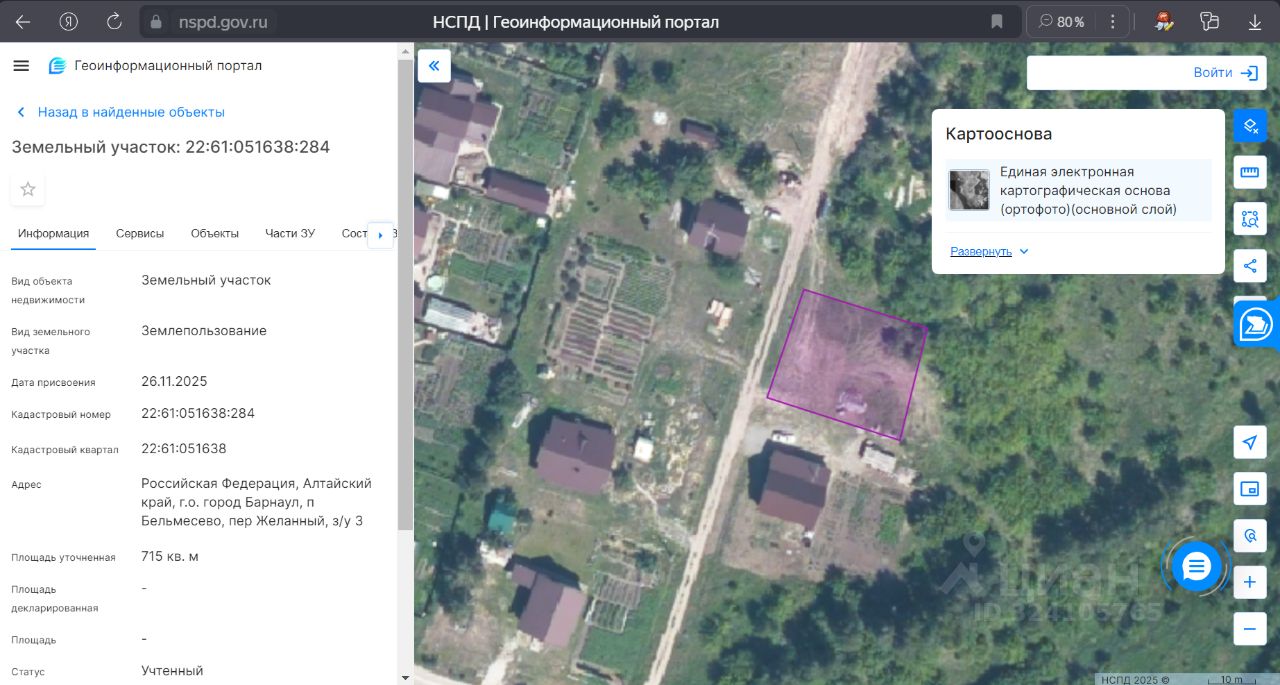 Земельный участок 715 кв.м. Кадастровый номер: 22:61:051638:284в собственности, Фасад 25 мх х 30 м, вид разрешенного использования: для индивидуального жилищного строительства, ЭЛЕКТРИЧЕСТВО, ВОДА И ГАЗ проходят по границе участка. Участок правильной прямоугольной формы, произведен вынос границ земельного участка.