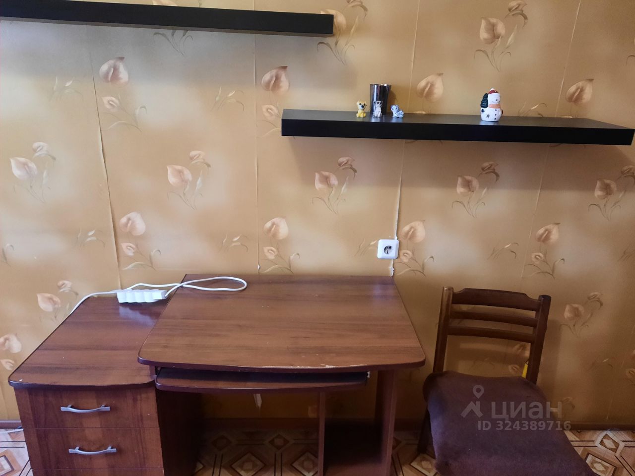 Из мебели: двуспальный диван, кресла, платяной шкаф, стол, стулья, тумбы.