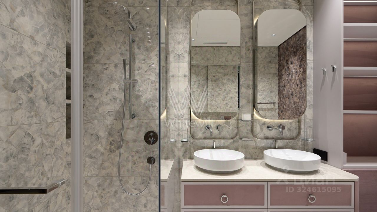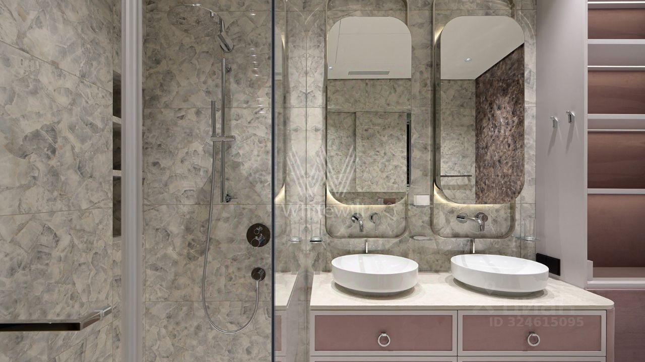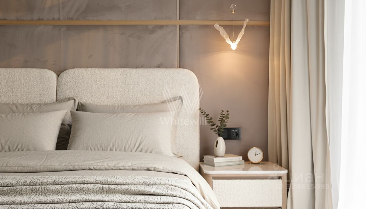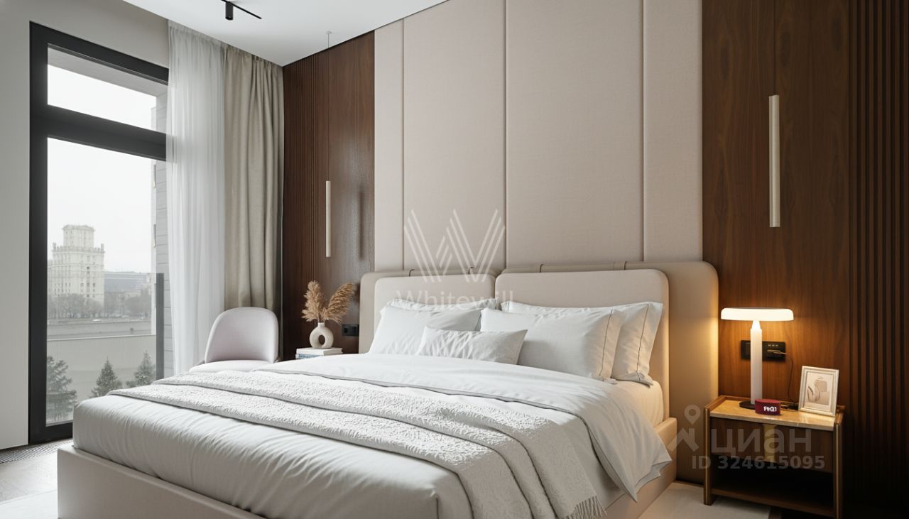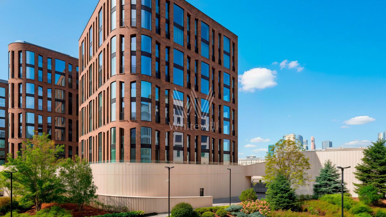 Функциональная планировка включает кухню-гостиную с обеденной зоной и биокамином, мастер-спальню с собственной ванной комнатой и гардеробной, вторую спальню со своим санузлом, гостевую спальню, кабинет, гостевой санузел, гардеробную, прачечную и холл. Панорамные окна ориентированы на две стороны света, открываются виды на Москву-реку и благоустроенную территорию комплекса.