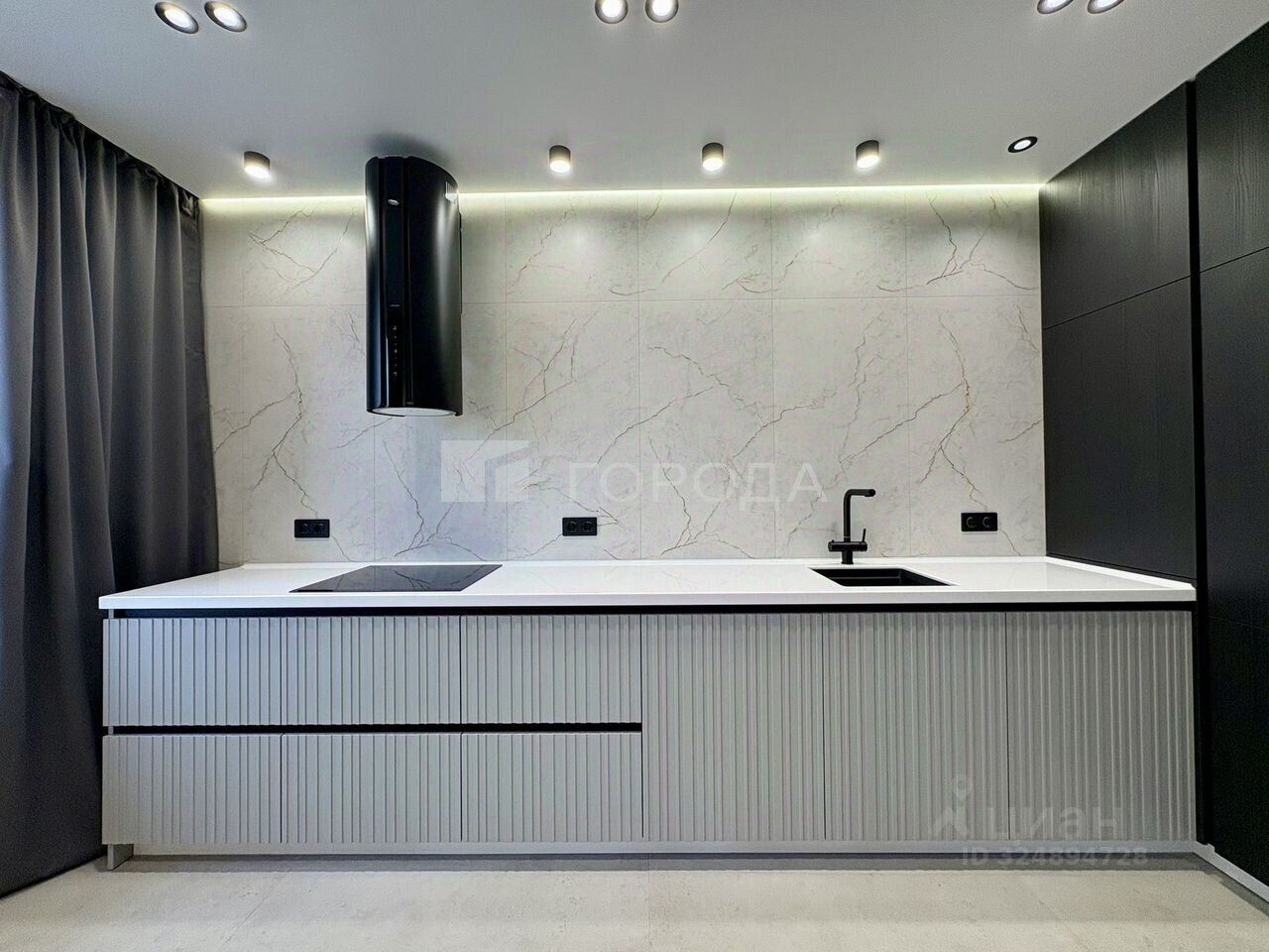 Заказные решения, а не типовые сборки: кухня с каменной столешницей, интегрированная техника (включая винный шкаф), продуманная система хранения.