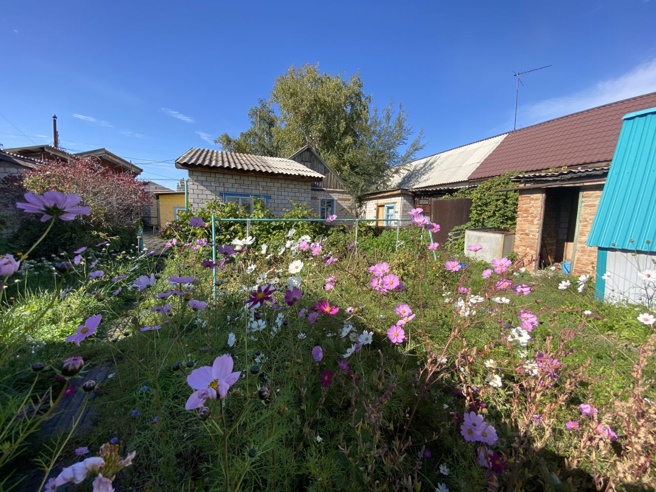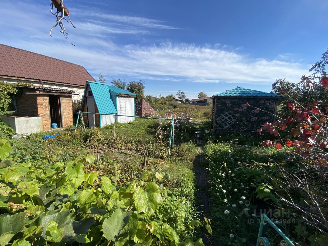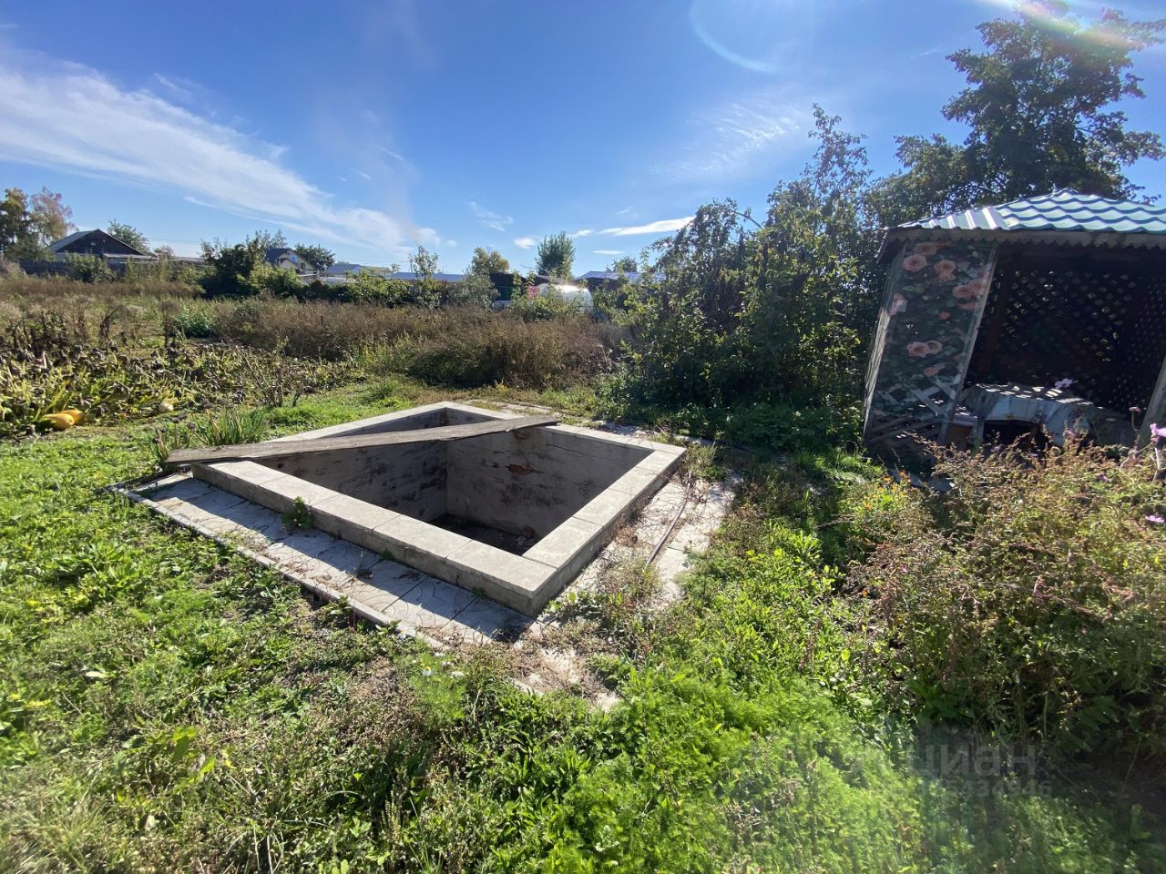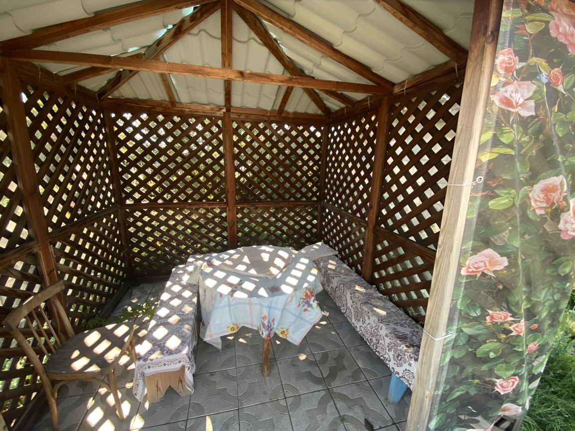 Участок 15 соток: Большой и ровный. Ухоженные культурные насаждения: яблони, сливы, вишня, виноград и др. (плодоносящий сад/огород). Зона отдыха: Беседка, бассейн, летний душ, уличный туалет.