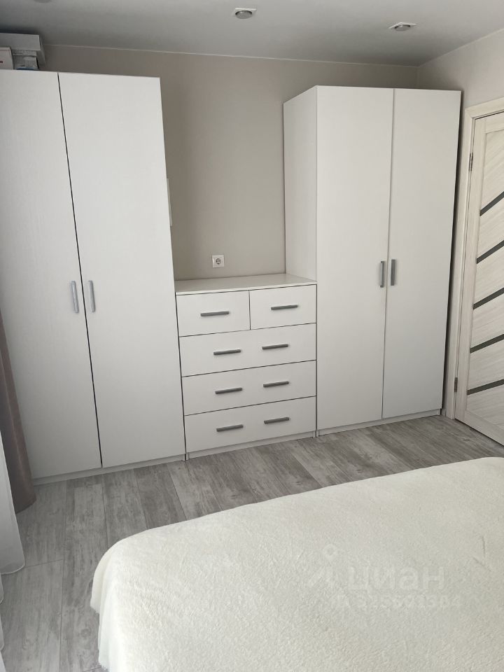 В гостиной установлен удобный диван и вместительный шкаф для хранения вещей. В спальне также имеется кровать и большой шкаф, комод.