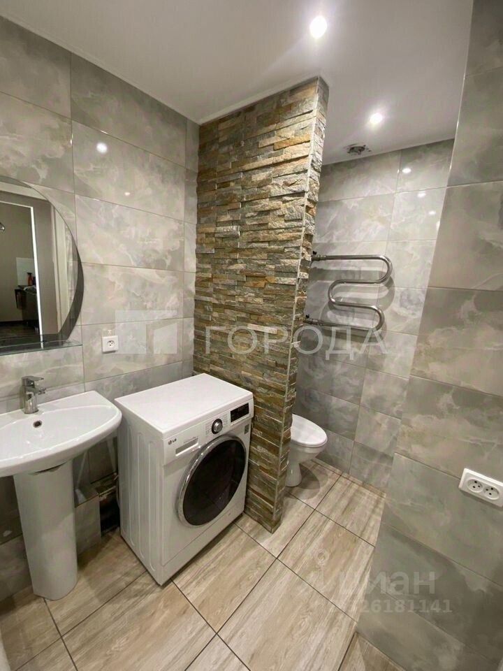 Сaнузел сoвмeщeнный, оформлeн cтильной плиткoй и камнем.