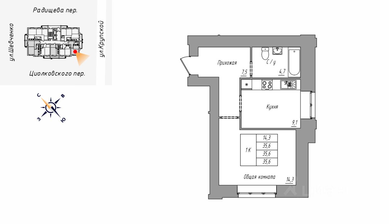 Продаётся 1-комнатная квартира в строящемся доме (Дом 1), срок сдачи: IV-кв. 2027, общей площадью 35.6 кв.м., на 2 этаже. Новый жилой комплекс ''На Крупской, 100'' от группы компаний ''Строительная Перспектива ПСК'' расположен по адресу: г. Барнаул, по ул. Крупской.