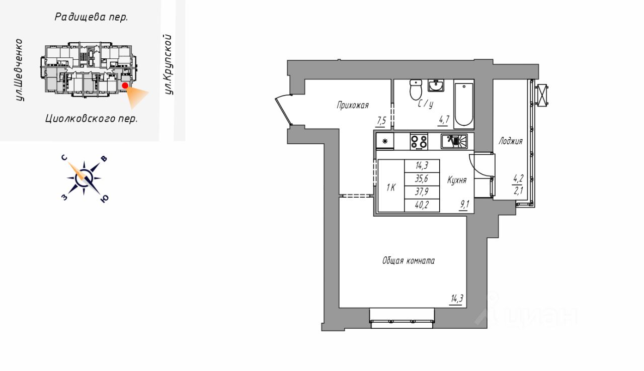 Продаётся 1-комнатная квартира в строящемся доме (Дом 1), срок сдачи: IV-кв. 2027, общей площадью 40.2 кв.м., на 10 этаже. Новый жилой комплекс ''На Крупской, 100'' от группы компаний ''Строительная Перспектива ПСК'' расположен по адресу: г. Барнаул, по ул. Крупской.