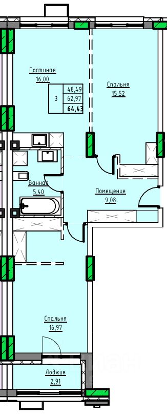 Общая площадь64,43 м2