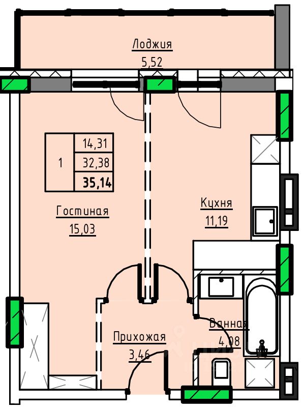 Общая площадь35,14 м2