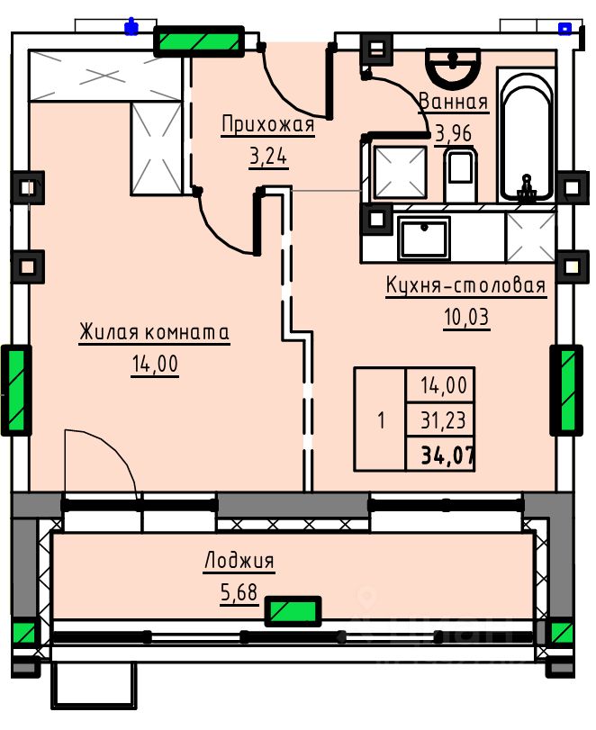 Общая площадь34,07 м2