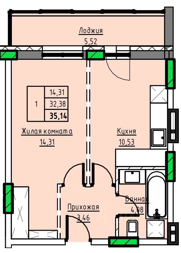 Общая площадь35,14 м2