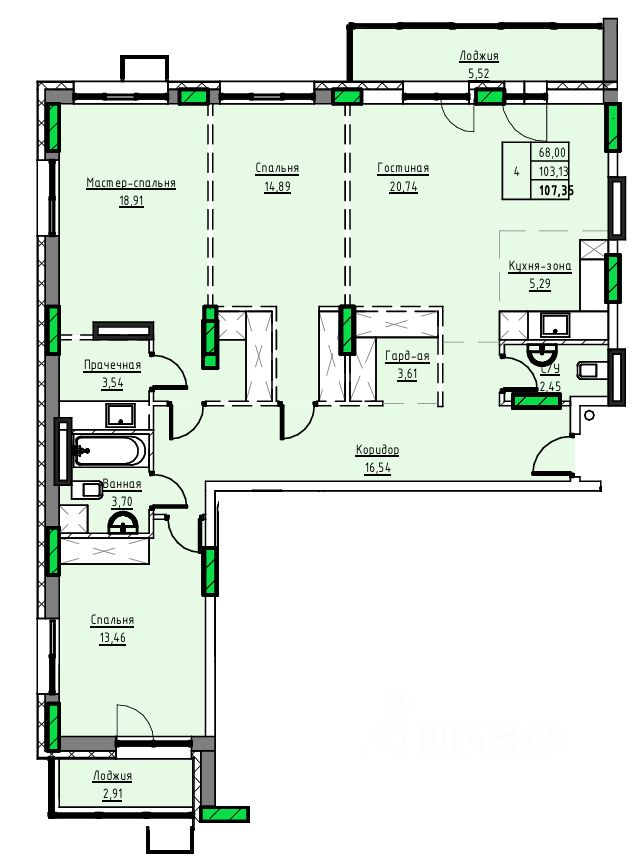 Продаётся 4-комнатная квартира в строящемся доме (Дом 1), срок сдачи: II-кв. 2029, общей площадью 107.35 кв.м., на 10 этаже. 10-ти этажный жилой дом в г. Заринске по адресу пр-т. Строителей, 29в. Проектом предлагается 3-х подъездный, 10-ти этажный жилой дом с встроенными на первом этаже помещениями общественного назначения. Исходя из ориентации дома входы в подъезды предусмотрены со стороны двора, тогда как в нежилые помещения - со стороны пр-т. Строителей. Вокруг здания предусматривается круговой проезд для автомобильного транспорта. Парковки для постоянного, временного хранения автомобилей, а также парковки для нежилых помещений предусмотрены, при этом согласно нормативам градостроительного проектирования Алтайского края от 29.12.2022 N 537, машино-мест может располагаться на прилегающей территории более 90 штук. Детские, спортивные площадки запроектированы с учетом нормативных расстояний от жилья и парковок. В жилом доме предусмотрено 222 квартир в том числе: Студии - 841-комн. - 482-х комн. - 543-х комн. - 304-х комн. - 6Имеется возможность объединения квартир для увеличения площади. Высота первого этажа - 3,6 м, жилых этажей - 3 м. В подвале предусмотрены кладовые для хранения негорючих вещей жильцов. В каждом подъезде имеется лестничная клетка и два лифта - пассажирский грузоподъемностью 400 кг и грузопассажирский грузоподъемностью 630 кг. Практически каждая квартира имеет выход на просторную застекленную лоджию площадью 6-9 кв.м. Все окна увеличенной высоты, что обеспечивает максимальное дневное освещение квартир. Часть квартир дополнительно оборудована мастер спальнями и гардеробными. Конструктивная схема монолитный железобетонный каркас с заполнением кирпичом и газобетоном с утеплителем. Облицовка 1-2 этажей клинкерным кирпичом. Выше штукатурка по стене. Окна - из металлопластика. Витражи 1-го этажа, остекления балконов - алюминиевые. Прилегающая территория к дому комплексно благоустраивается с асфальтированием проездов, озеленением и тротуарной плиткой. Площадки для игр детей и занятия спортом укомплектовываются элементами заводского изготовления. Жилой дом после строительства украсит центральную часть г. Заринска.