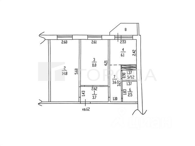 Общая площадь квартиры — 42,9 кв. м, жилая — 25,8 кв. м, площадь кухни — 6,1 кв. м. В квартире есть балкон, один раздельный санузел.