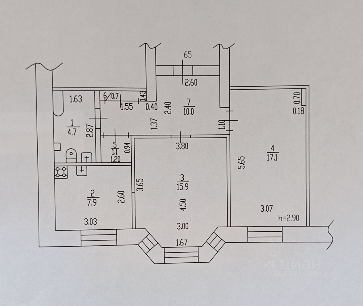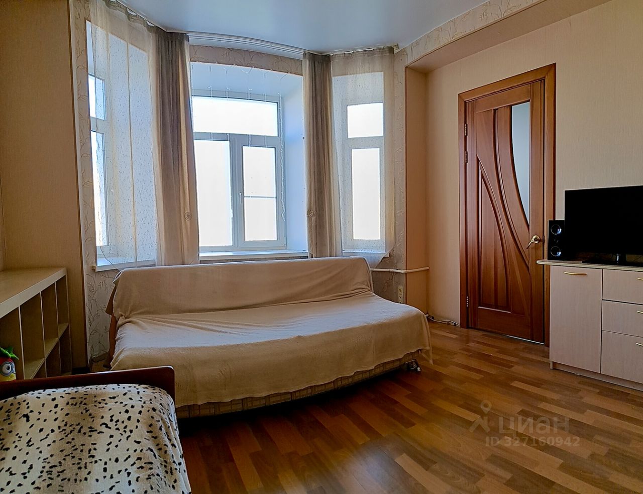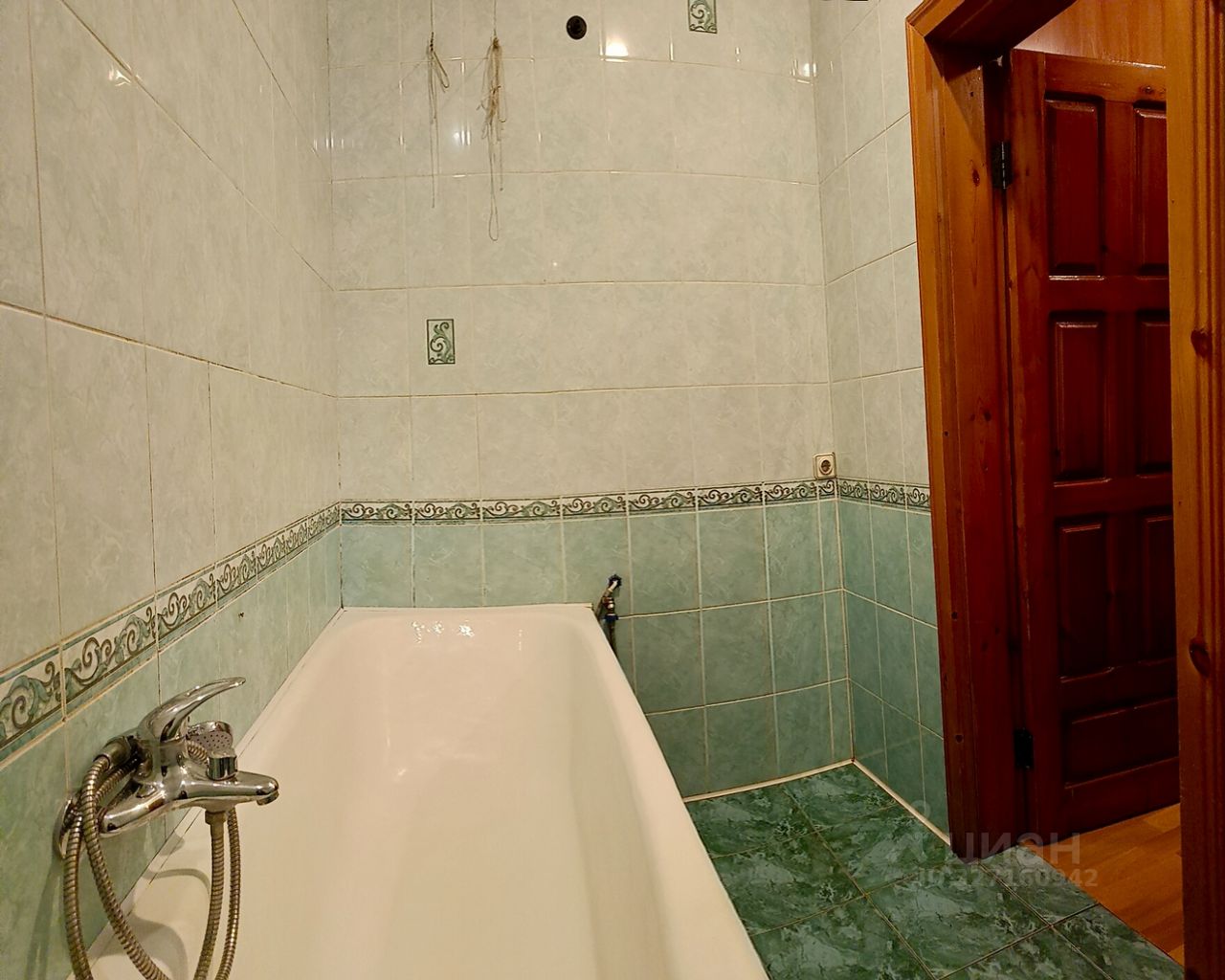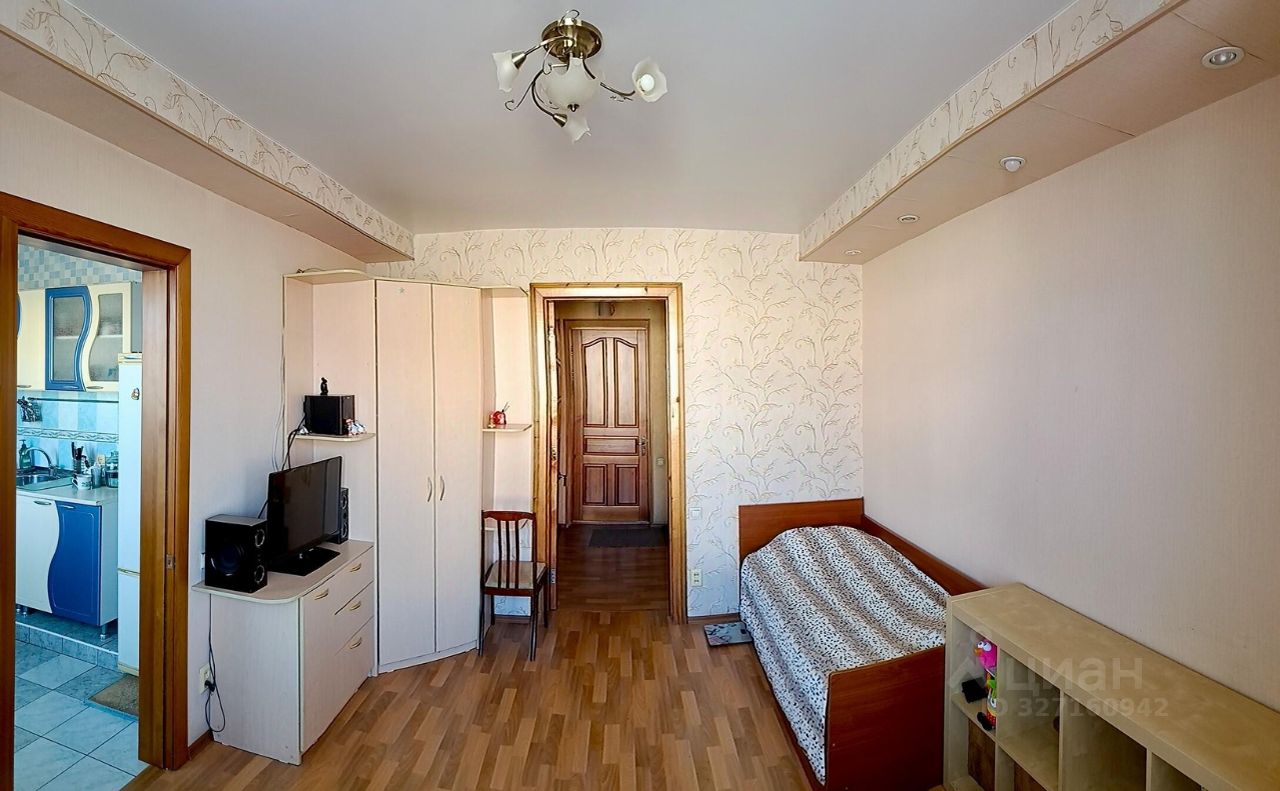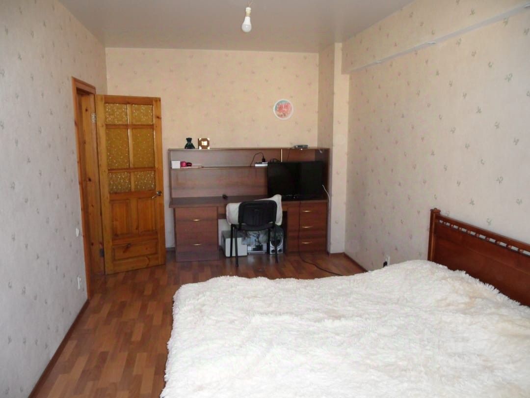 В квартире гипсокартон, кафель, деревянные двери. Санузел после перепланировки совмещённый, вход на кухню из центральной комнаты. Просторный коридор с двумя встроенными шкафами.