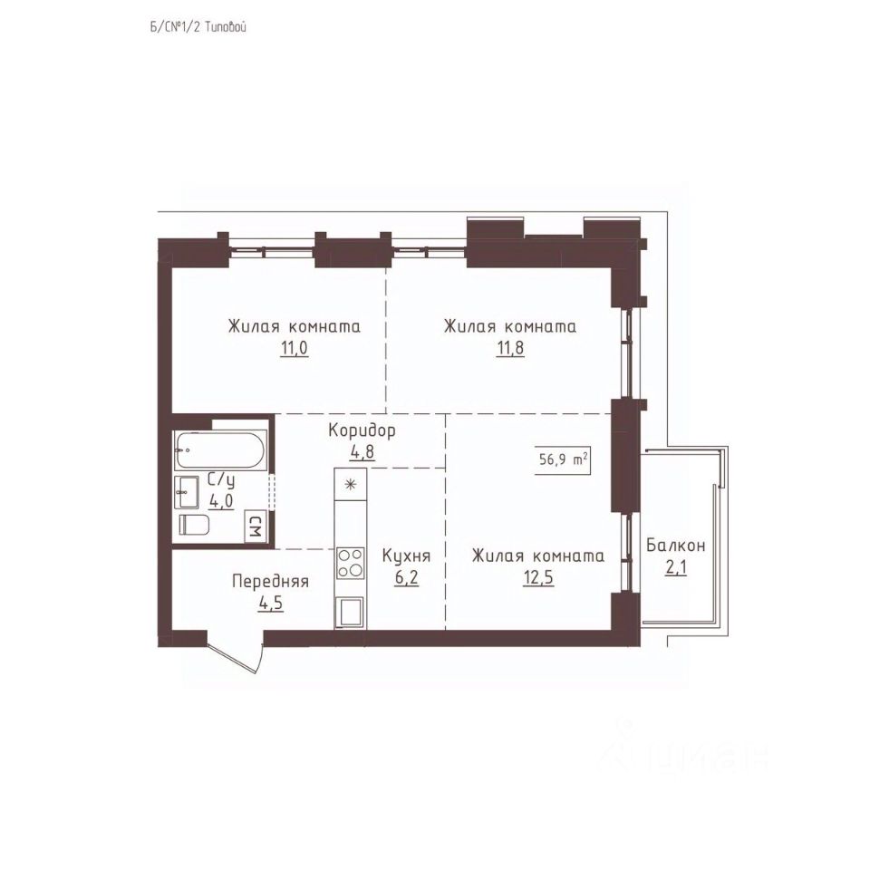 Общая площадь56,9 м2