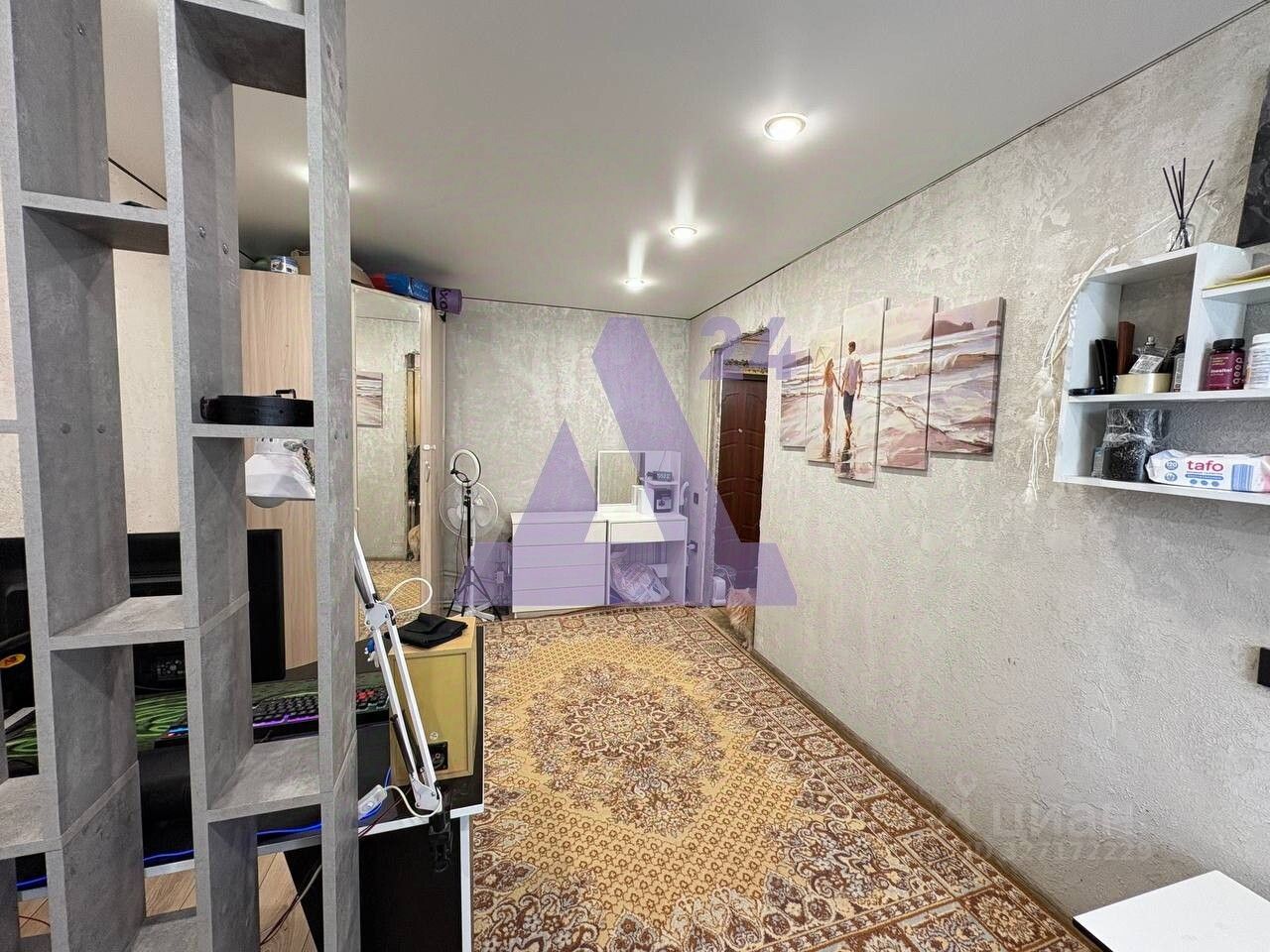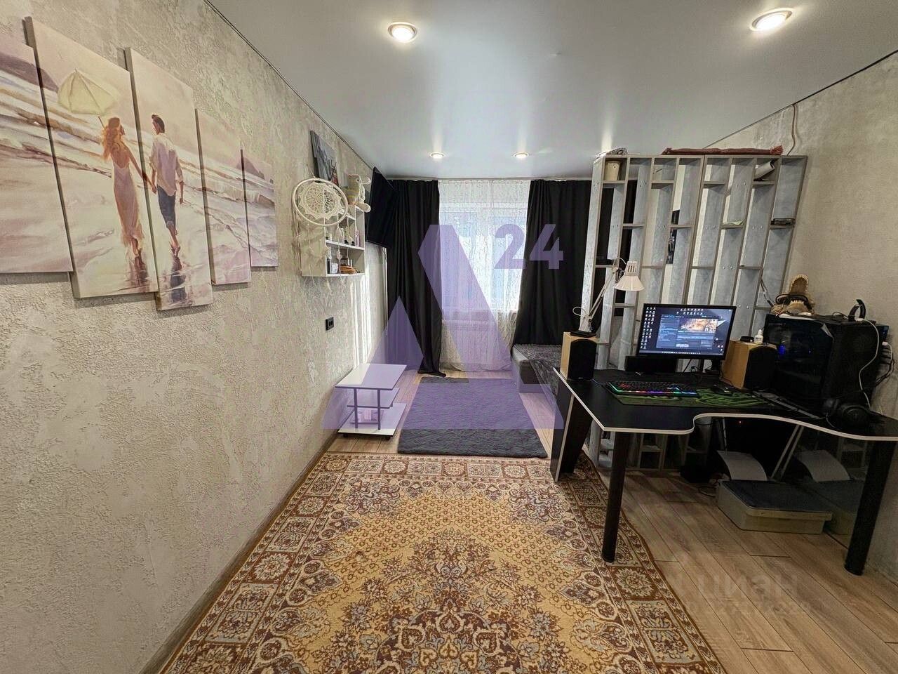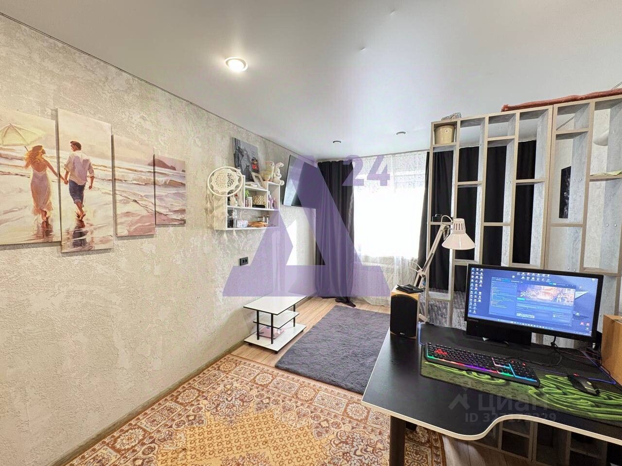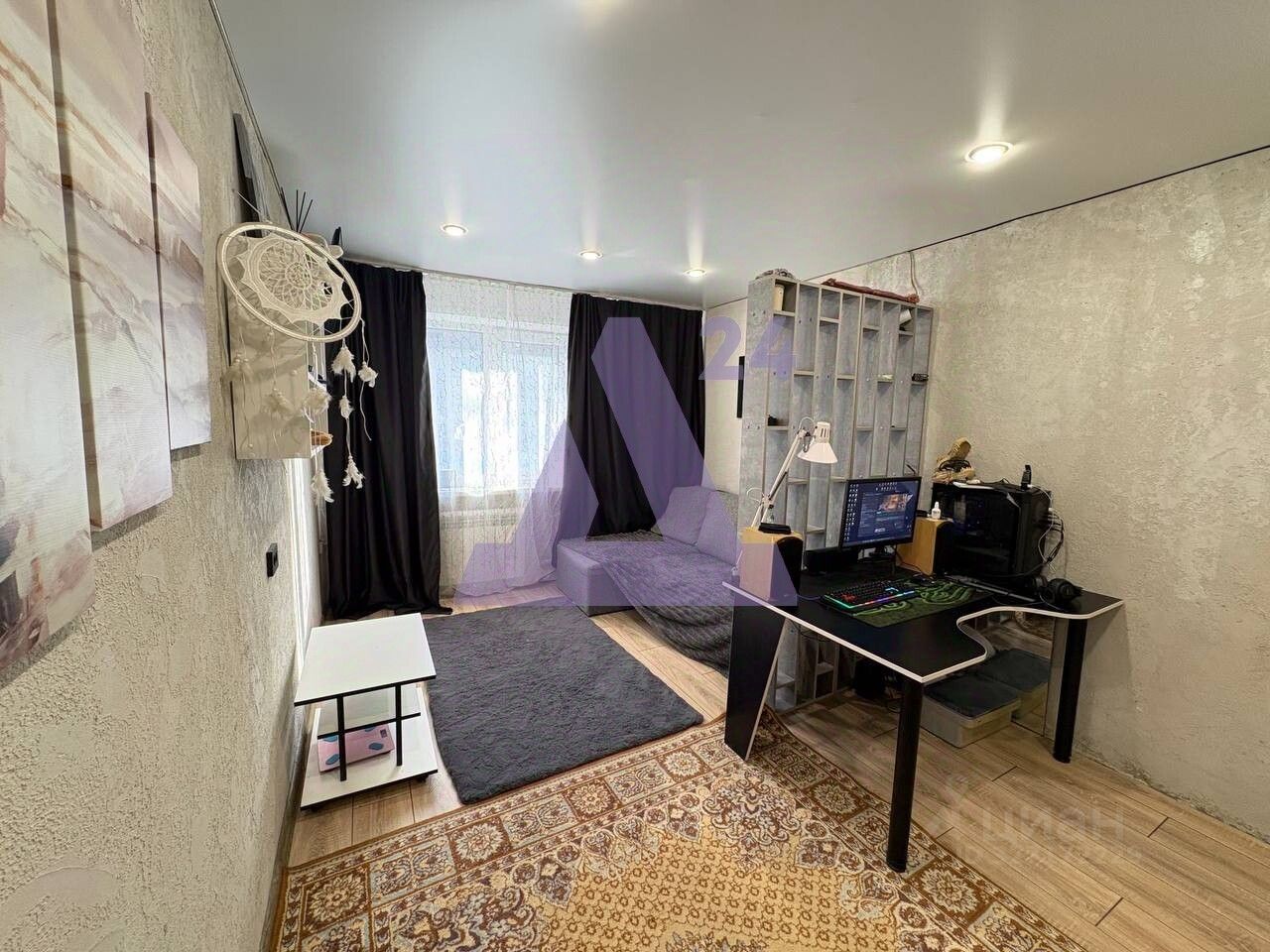 Жилая комната оформлена в светлых тонах, что визуально расширяет пространство. На полу — ламинат, установлен натяжной потолок, стены отделаны декоративной штукатуркой. Состояние позволяет заехать и проживать, при этом интерьер легко адаптировать под собственные предпочтения.