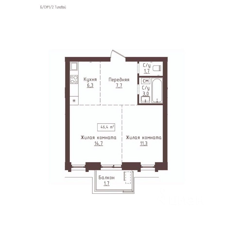 Общая площадь46,4 м2